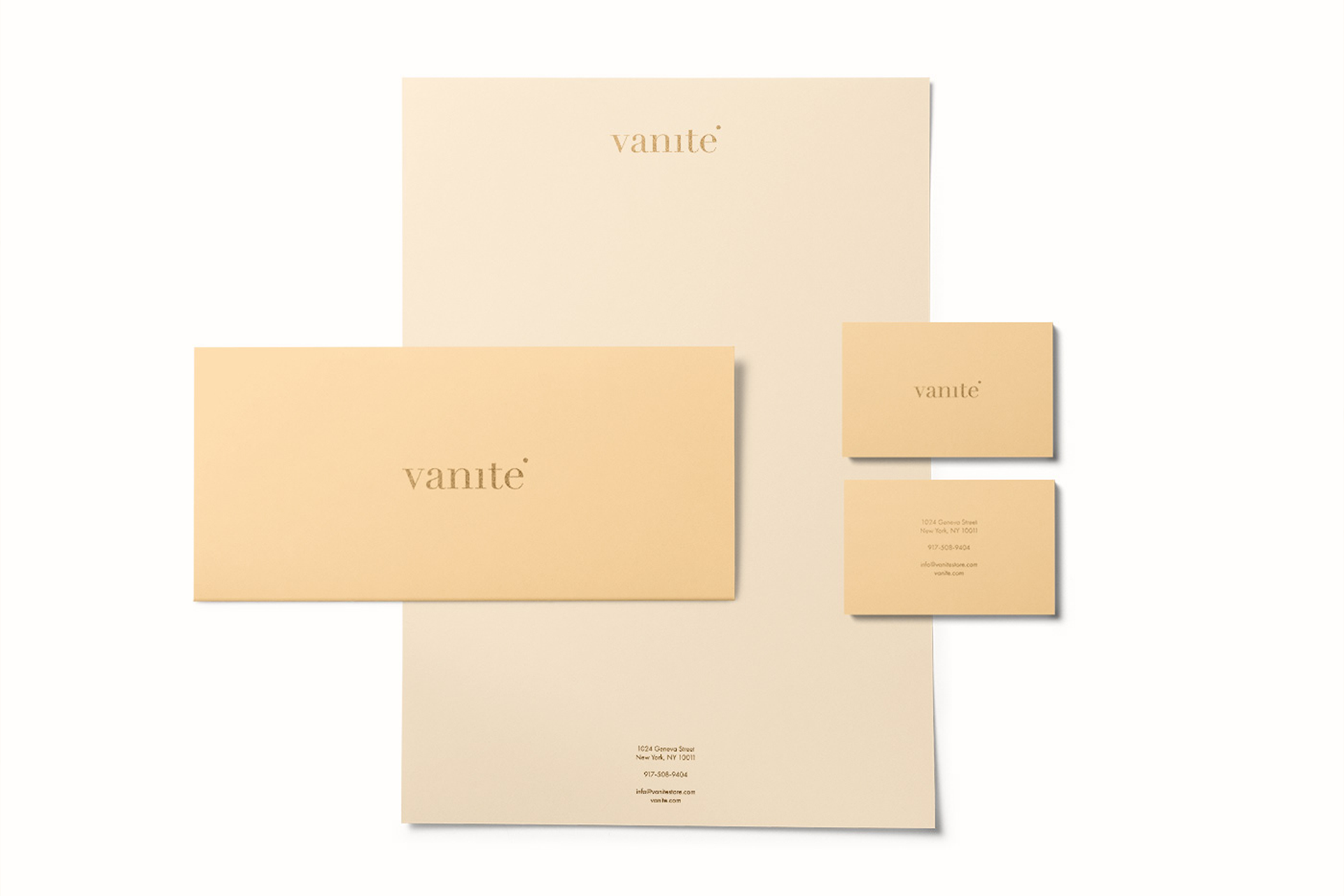 Vanité is a cosmetic e-commerce. The name derives from the French translation of the word "vanity". The logo is inspired by Marilyn Monroe, especially her lips and her beauty mark. Details of various items, such as business cards or headers, are printed in gold to evoke luxury, perfection, and elegance.